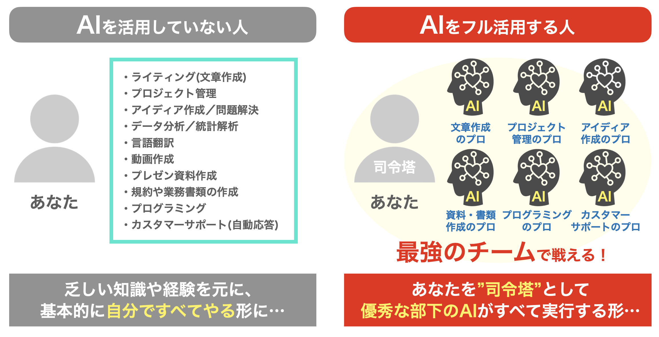 でも、どんな人でもAIを100%活用することで、各分野のプロフェッショナルを集めた最強チームで様々な分野で、幅広く戦えるようになります。