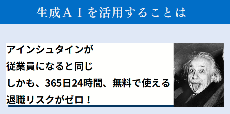 今回のセミナーの中でも、AIを自由に使いこなすということは『天才のアインシュタイン』を自分の部下として24時間、365日、タダで働き続けてもらうようなもの、、、